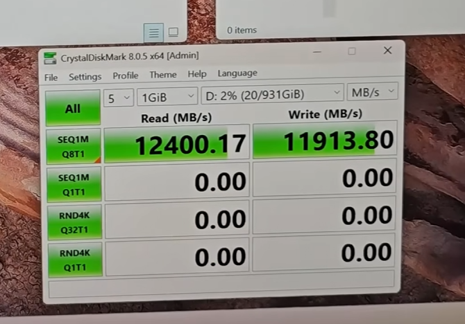 בבדיקות שביצעתי על מחשב נייד עם חיבור NVMe Gen 5, הכונן הציג תוצאות מרשימות במיוחד. במבחן CrystalDiskMark גרסה 9.0.1 התקבלו מהירויות קריאה של 12,400.17 מגה־בייט לשנייה ומהירויות כתיבה של 11,913.80 מגה־בייט לשנייה. מדובר בביצועים שמתקרבים מאוד לנתוני היצרן וממחישים את הפוטנציאל האמיתי של התקן החדש בשימוש יומיומי.