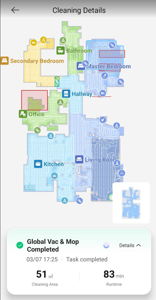 בפועל, יכולת זיהוי המכשולים עבדה בצורה מרשימה מאוד. השואב הצליח לעקוף רהיטים, צעצועים קטנים וחפצים שונים ברחבי הבית ללא התנגשויות מיותרות. עם זאת, במהלך אחד ממחזורי הניקוי הוא נתקל בכבל מתחת למיטה, דבר שגרם להסרה של אחת מהמטליות המסתובבות. לאחר הגדרת האזור סביב הכבל כאזור אסור לניקוי באפליקציה, הבעיה לא חזרה על עצמה והמערכת המשיכה לעבוד בצורה תקינה.