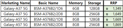 דגם Galaxy A57 5G בנפח אחסון של 512GB לא צפוי להיות מושק בשלב זה בישראל. בנוסף, גרסת Galaxy A37 5G בנפח 256GB גם היא אינה מתוכננת להשקה מקומית בשלב הנוכחי, מה שמצביע על התאמת ההיצע לשוק המקומי ולביקושים הצפויים.